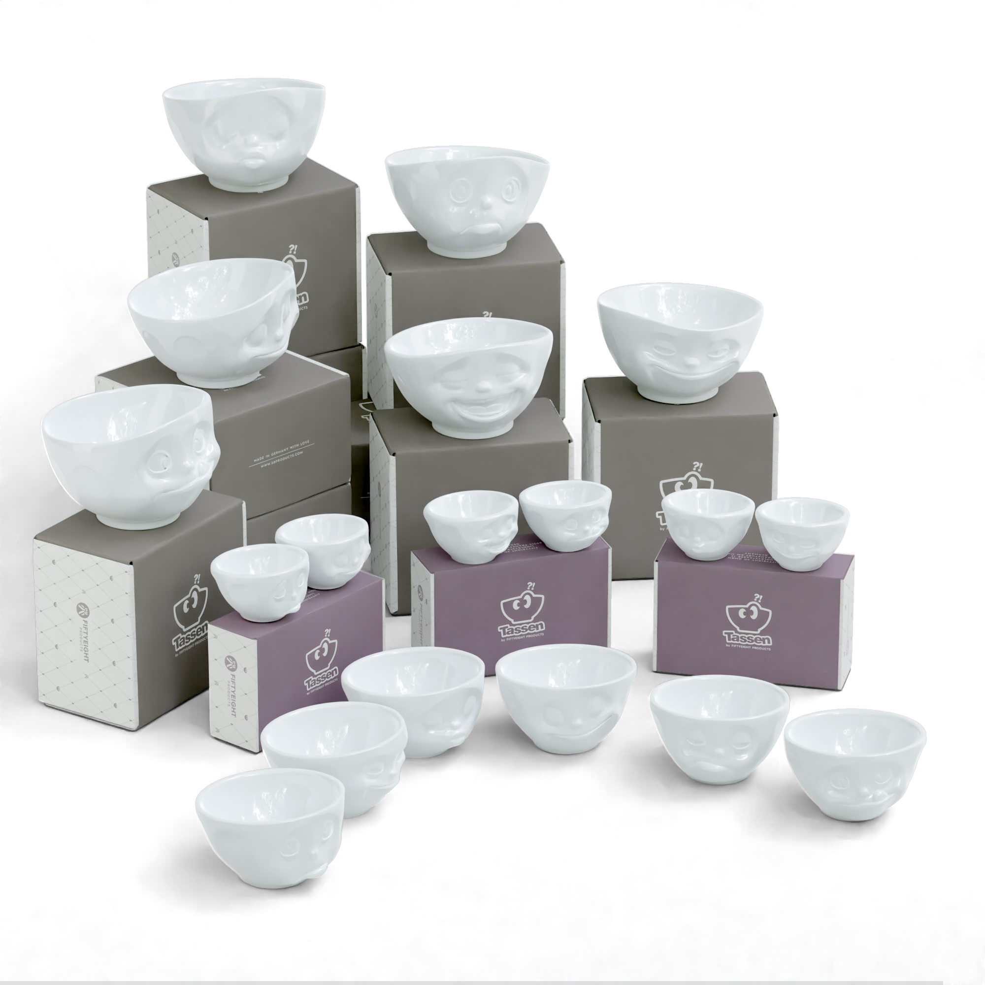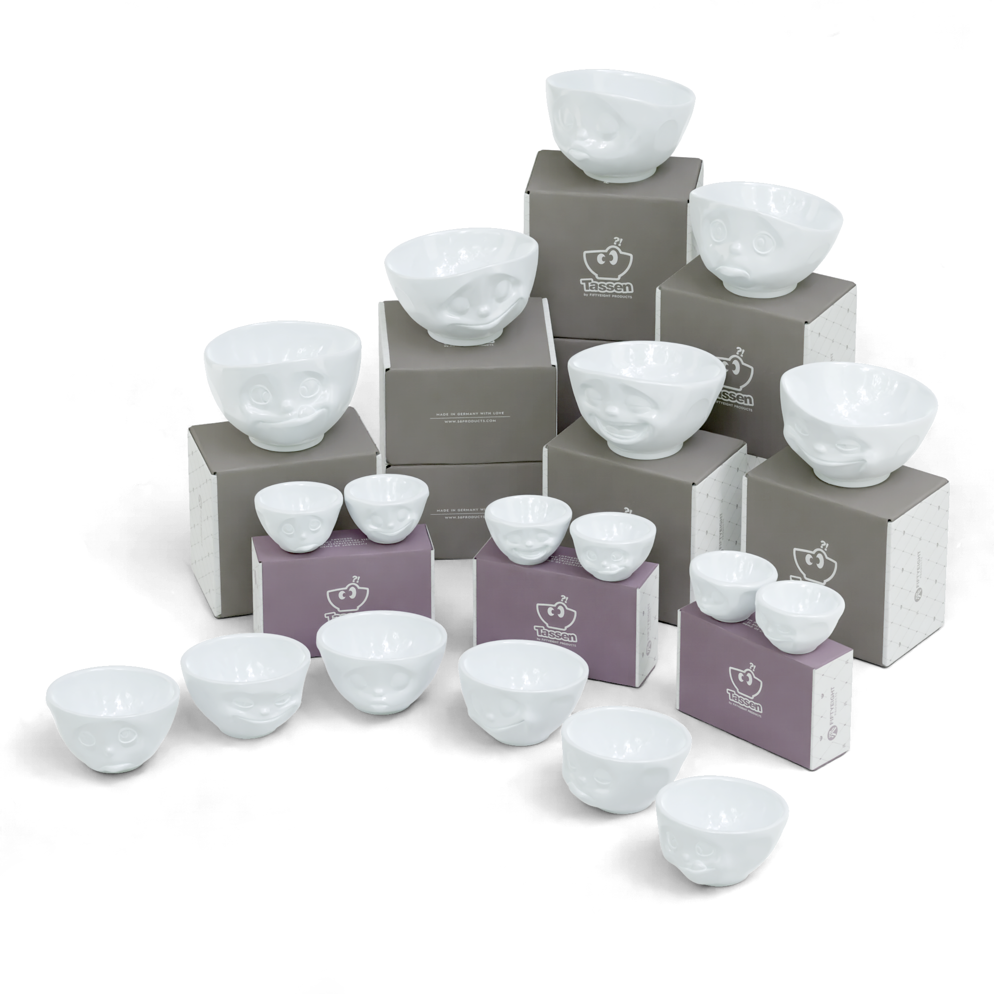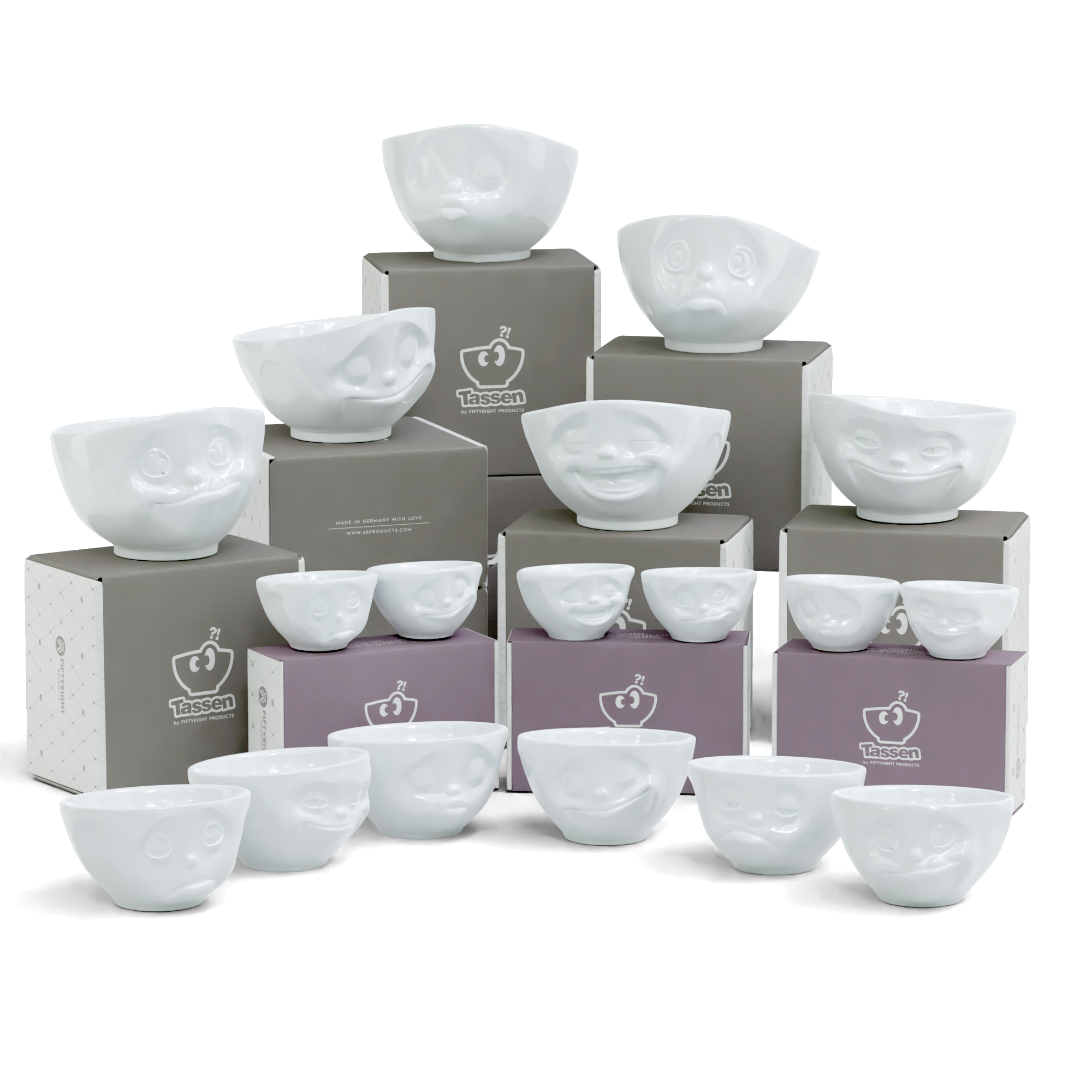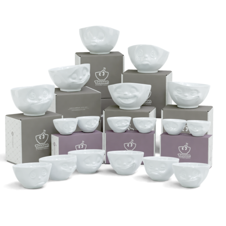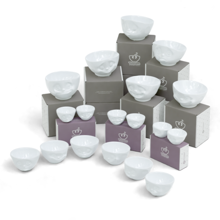 6 x bowl 1 each GRINNING, SULKING, KISSING, HAPPY, TASTY and LAUGHING (500 ml); 6 bowls in 3 medium bowls sets no. 1, no. 2 and no. 3 KISSING & GRINNING, HAPPY & OH PLEASE! and TASTY & SNOOZY (200 ml); 6 small bowls in 3 small bowl sets no. 1, no. 2 and no. 3 KISSING & GRINNING, DREAMY & HAPPY and LAUGHING & TASTY