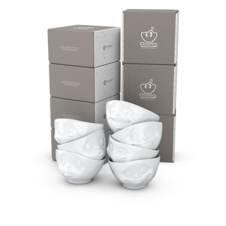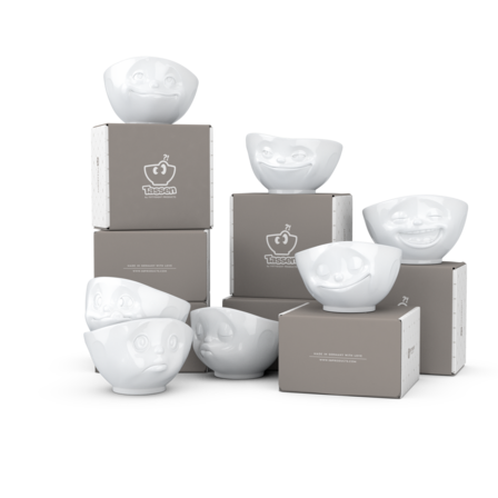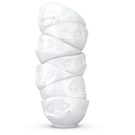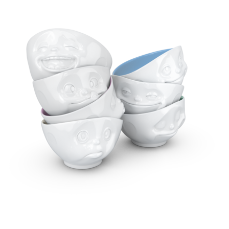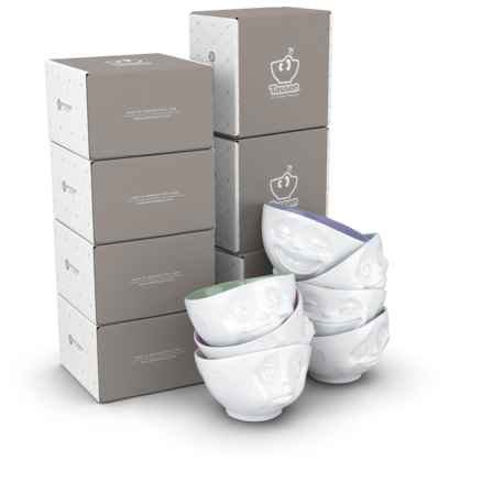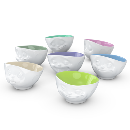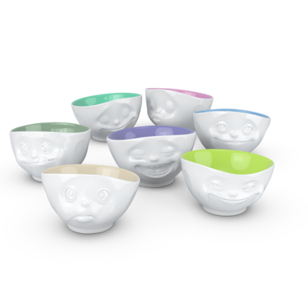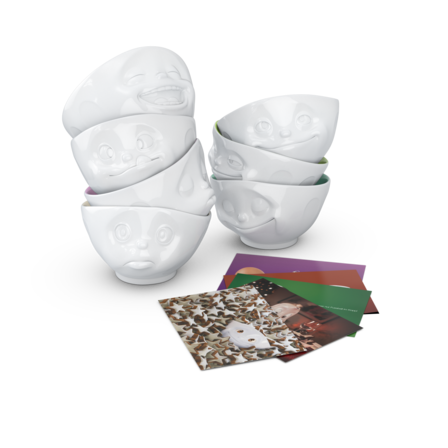 Our 500 ml bowl GRINNING pistachio inside, SULKING sand inside, KISSING berry inside, HAPPY jade inside, DREAMY ocean inside, TASTY pine inside and LAUGHING lavender inside + 5 postcards.