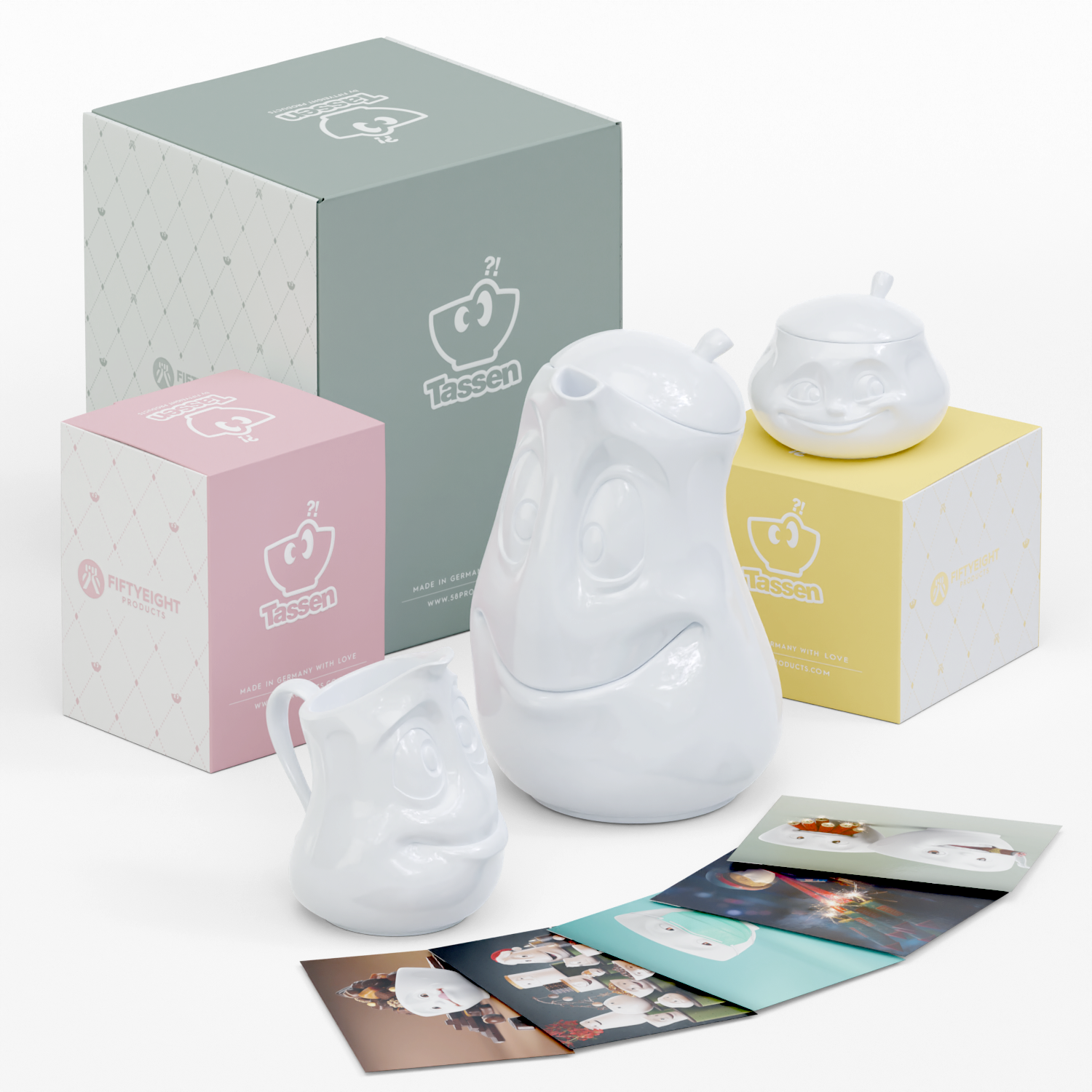Our Pot GOOD MOOD, the little Jug JOLLY and our sugar bowl SWEET + 5 postcards