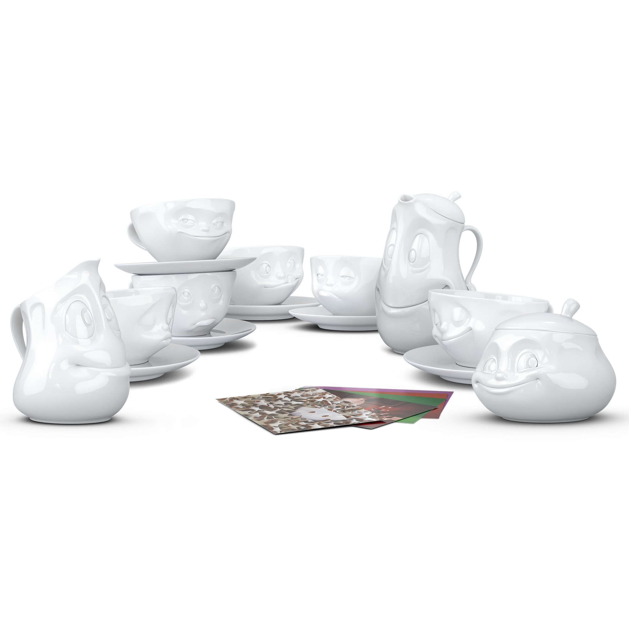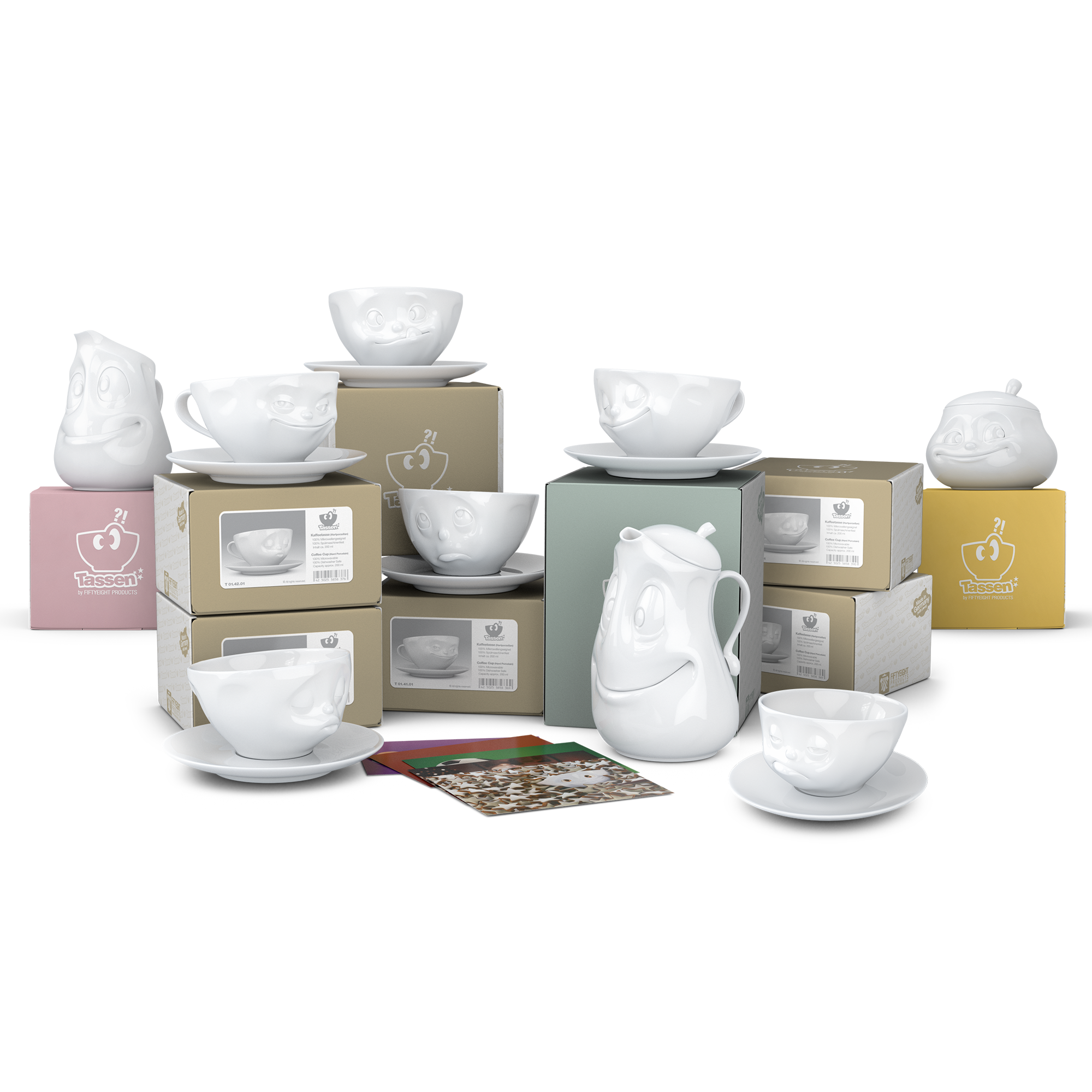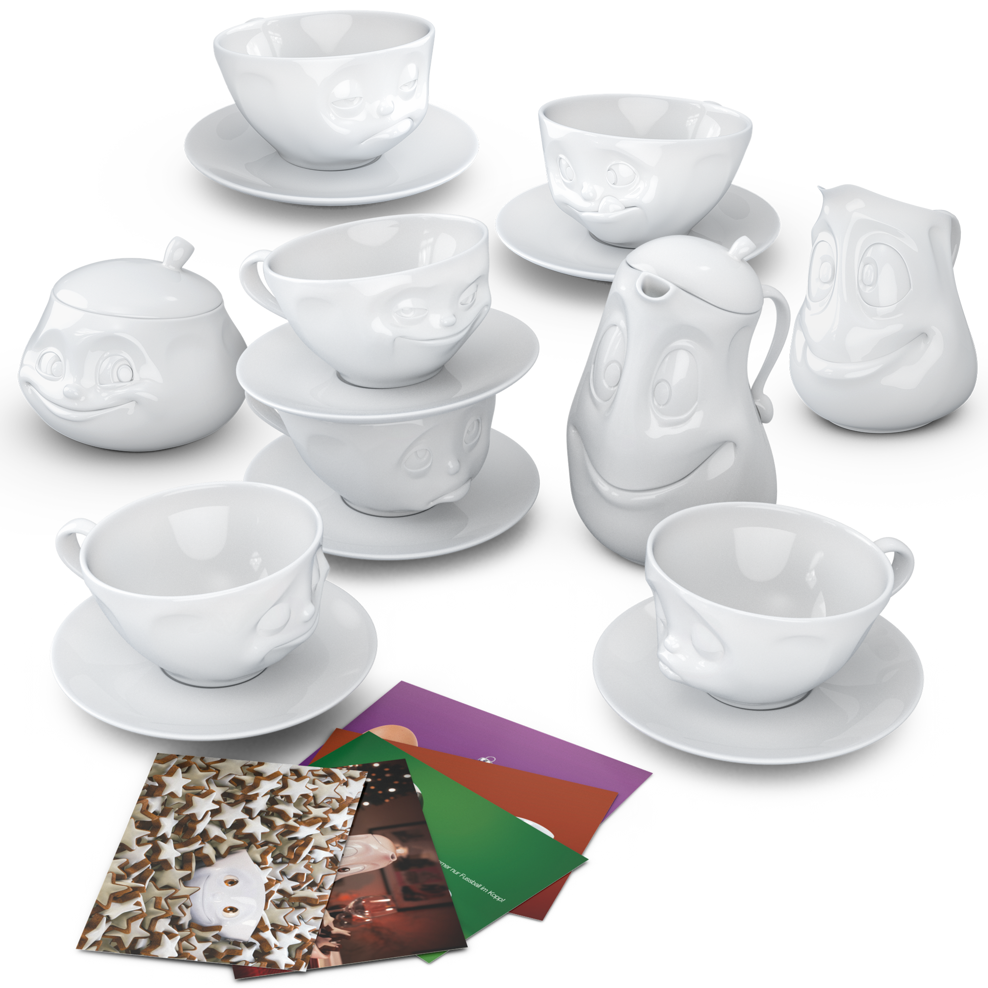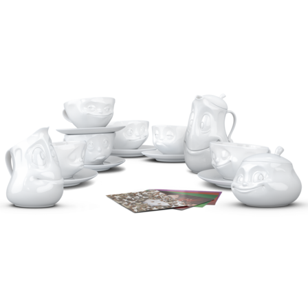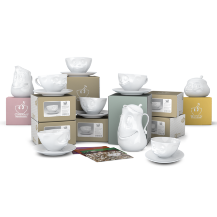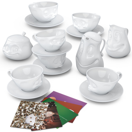 OH PLEASE!, SNOOZY and TASTY (200 ml) and our pot GOOD MOOD (1200 ml), little jug JOLLY, sugar bowl SWEET + 5 postcards