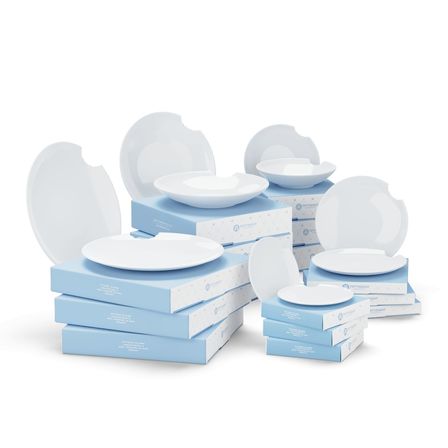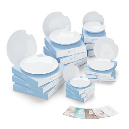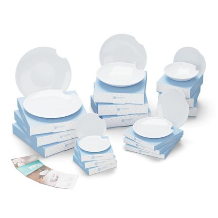 This special MEGA PLATES SET brings you all our 5 different plate sizes in one package to serve six guests at your dining table. By the way, he understated elegance of our plates goes well with the design of our espresso and coffee cup saucers. The color and quality of the plates correspond to the other TASSEN porcelain products.