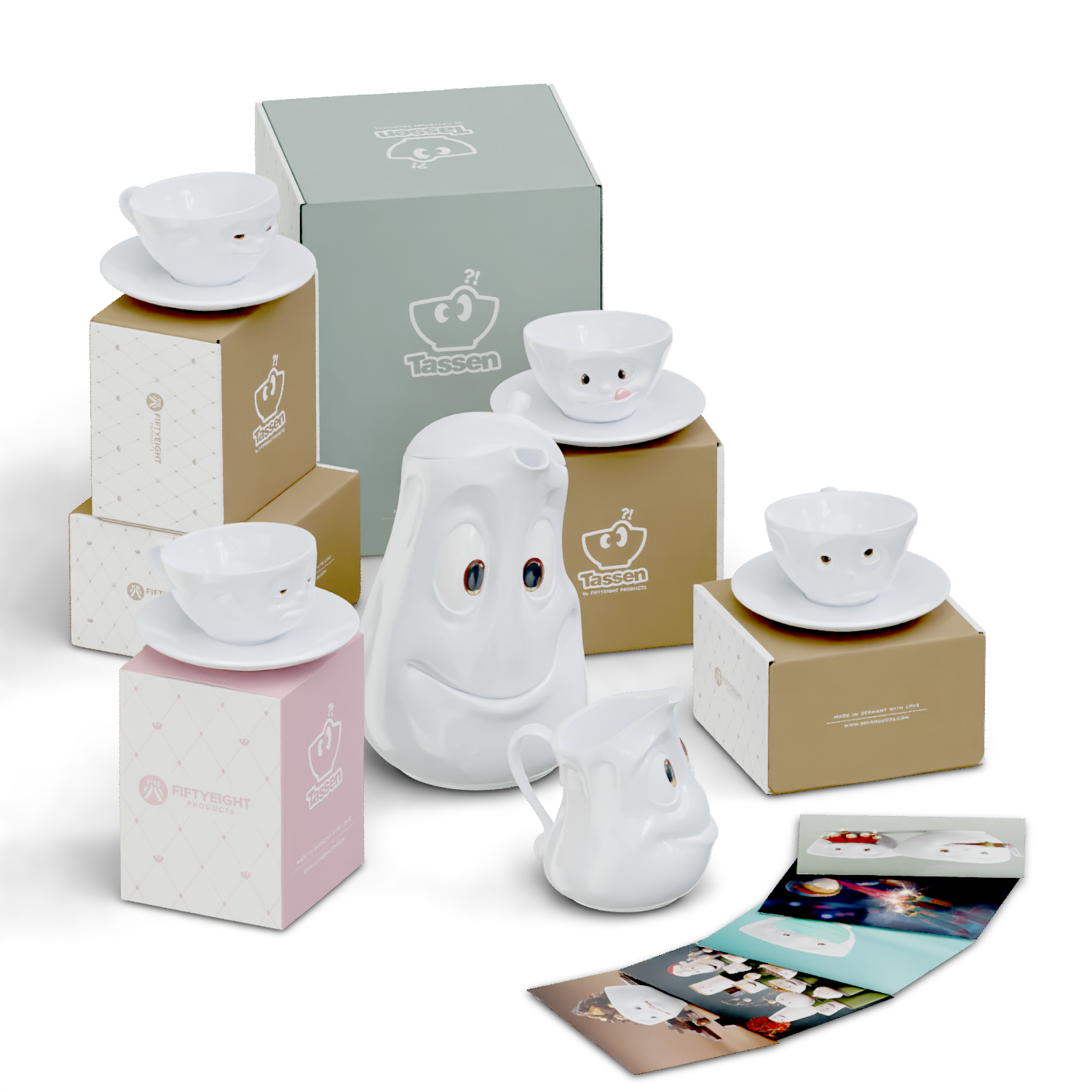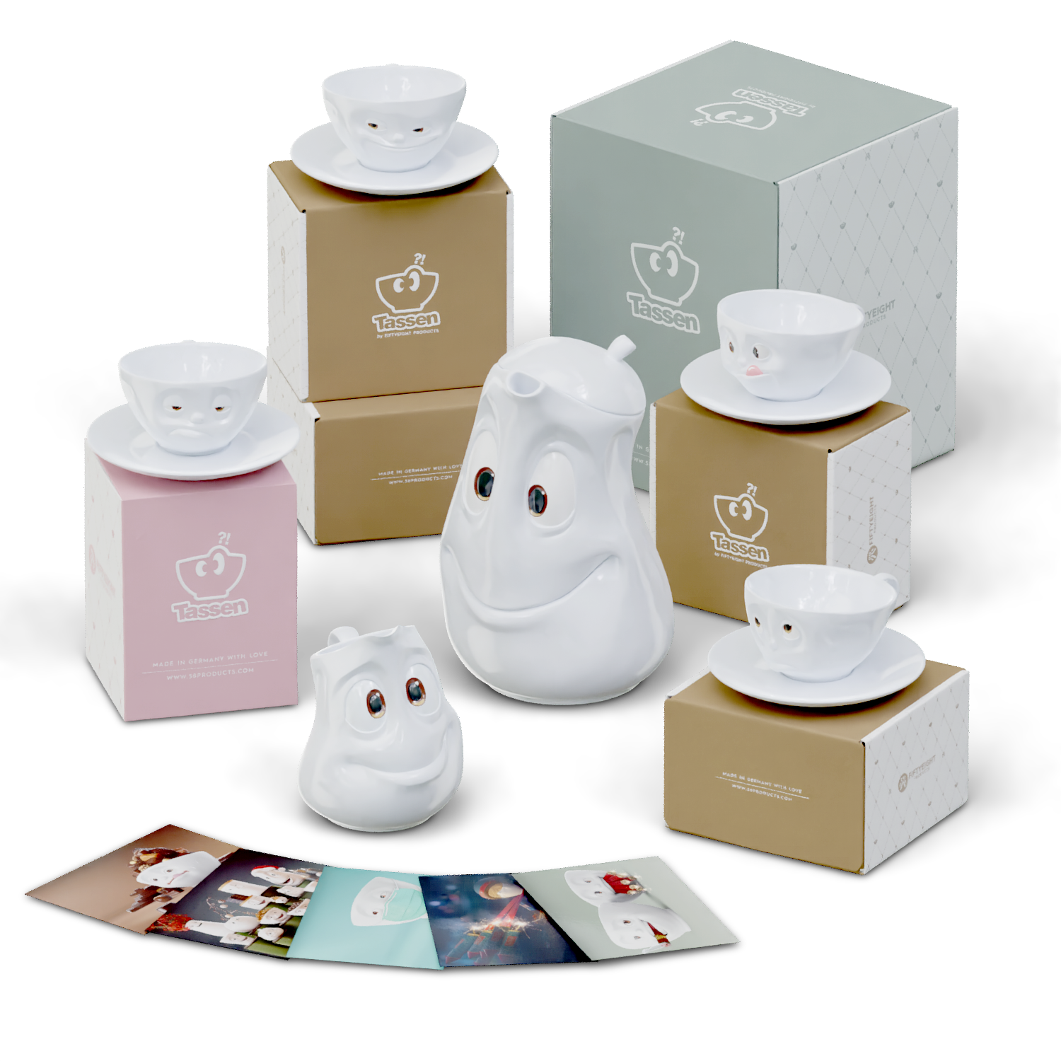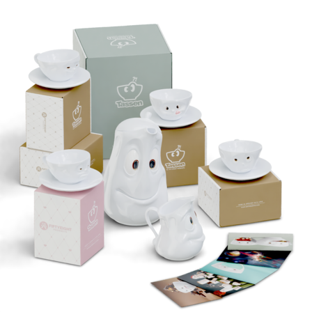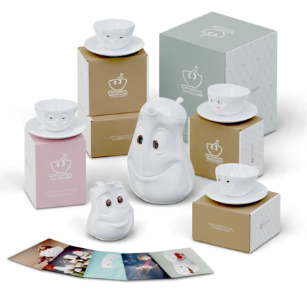 OH PLEASE!, SNOOZY and TASTY (200 ml) and our pot GOOD MOOD (1200 ml), little jug JOLLY, sugar bowl SWEET + 5 postcards