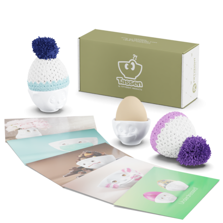 Here’s an Easter surprise at a special price: Our Egg Cups & Knit Hats pairs up our Egg Cups OH PLEASE & TASTY with a Knit Hat in navy blue/sky blue and lilac/magnolia, plus five TASSEN Postcards.