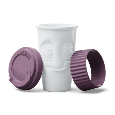 The Mug to Go with a TASTY face does not feature a handle, but it features a colorful sleeve for protecting the fingers from hot liquids. And as always, the mug itself is crafted from premium hard porcelain.