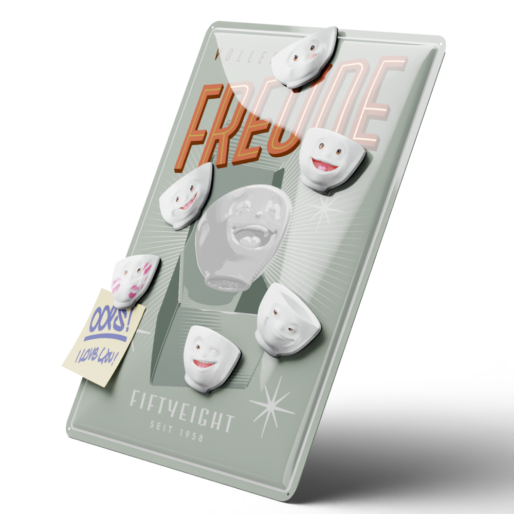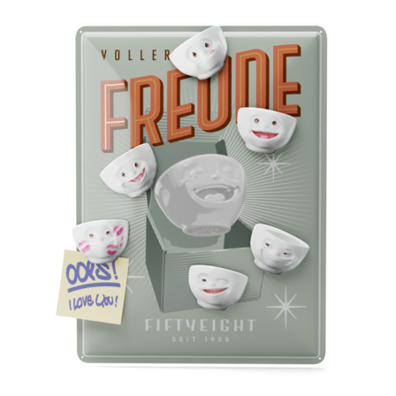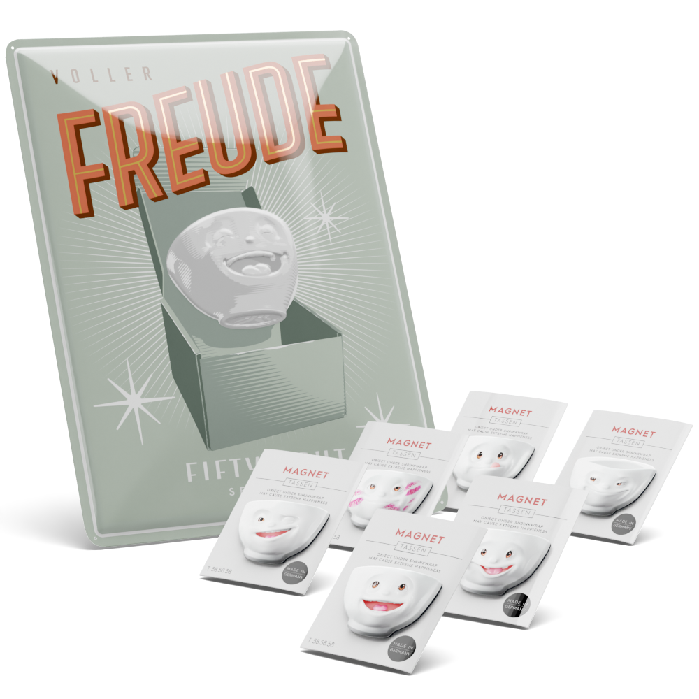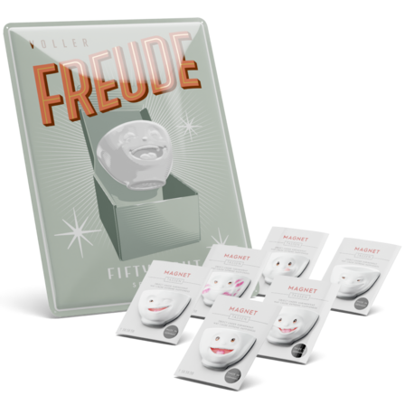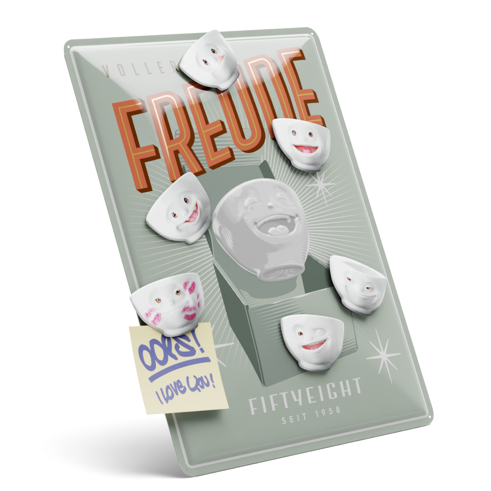 Turn our tin-plate sign FULL OF JOY into the perfect pin board – now as a set with 6 unique magnets + 5 postcards!