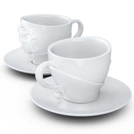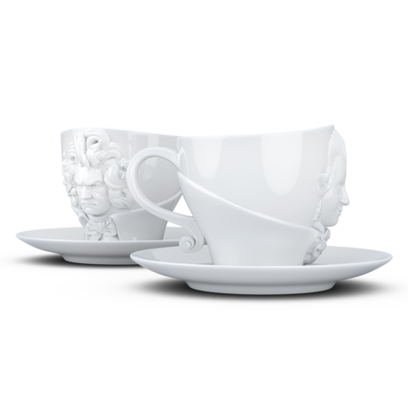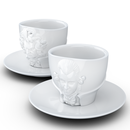Two exclusive coffee cups with a handle and saucer crafted from hard porcelain, featuring 3D-sculpted, hyper-contoured renderings of the artists’ facial expressions.