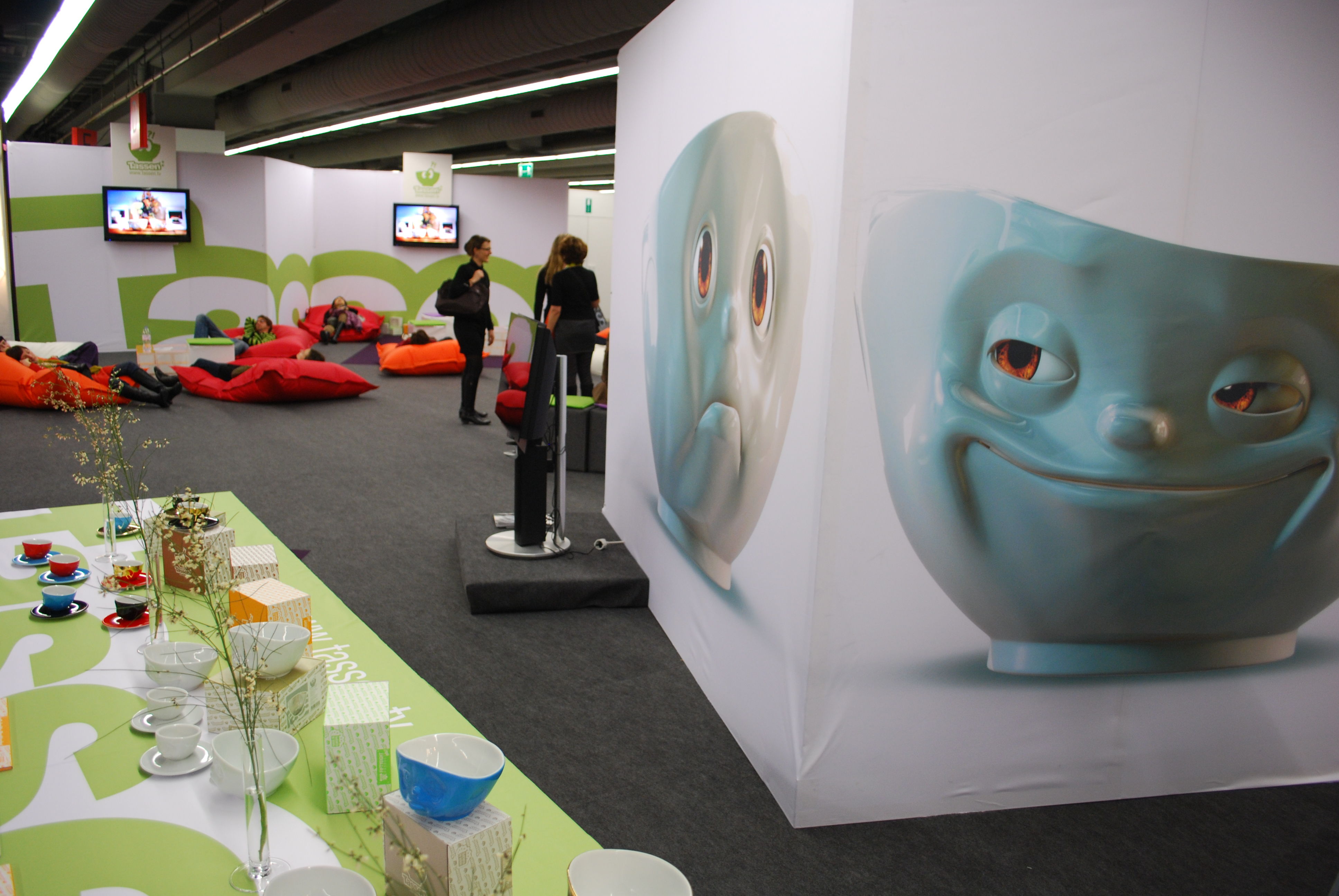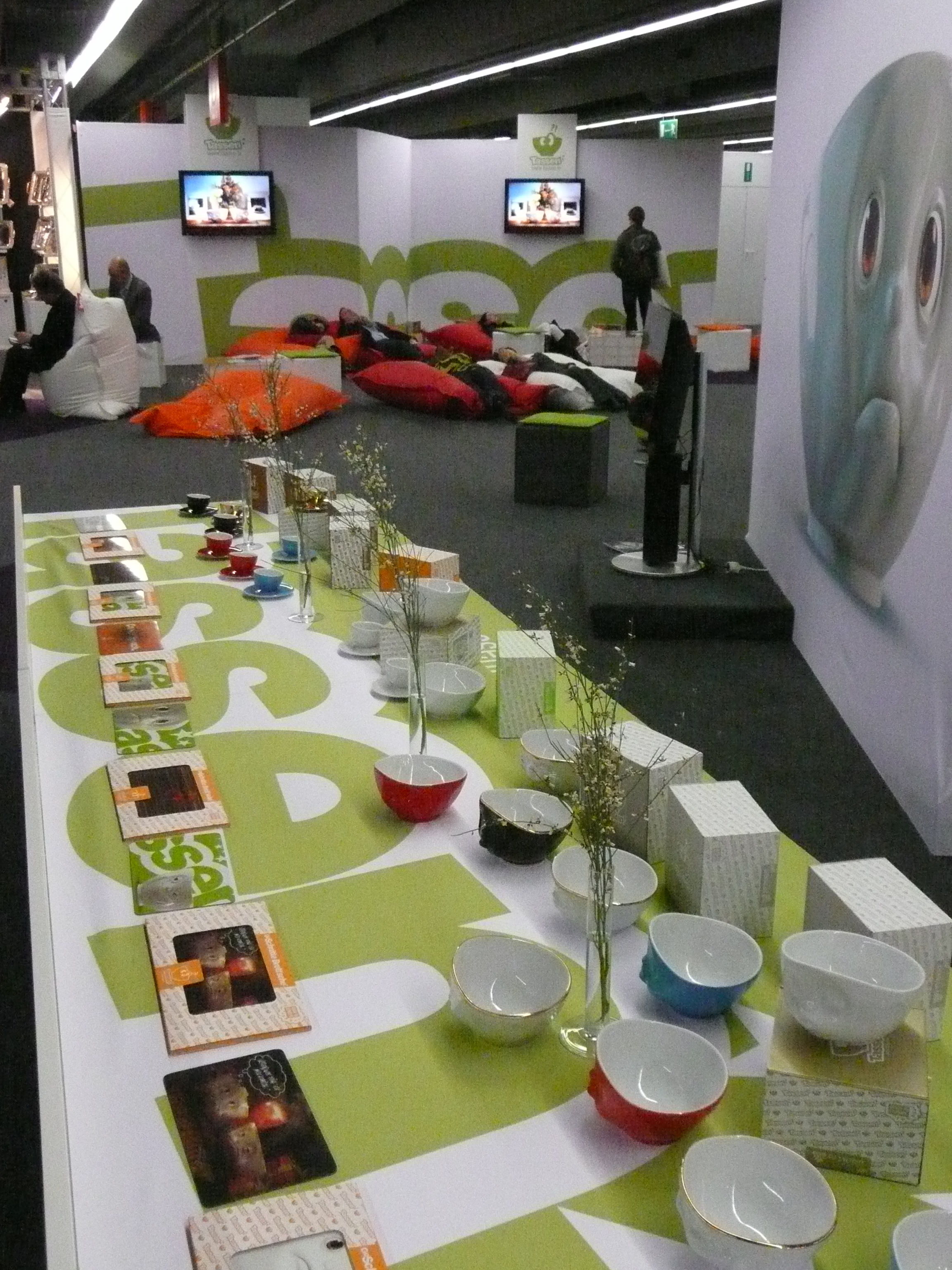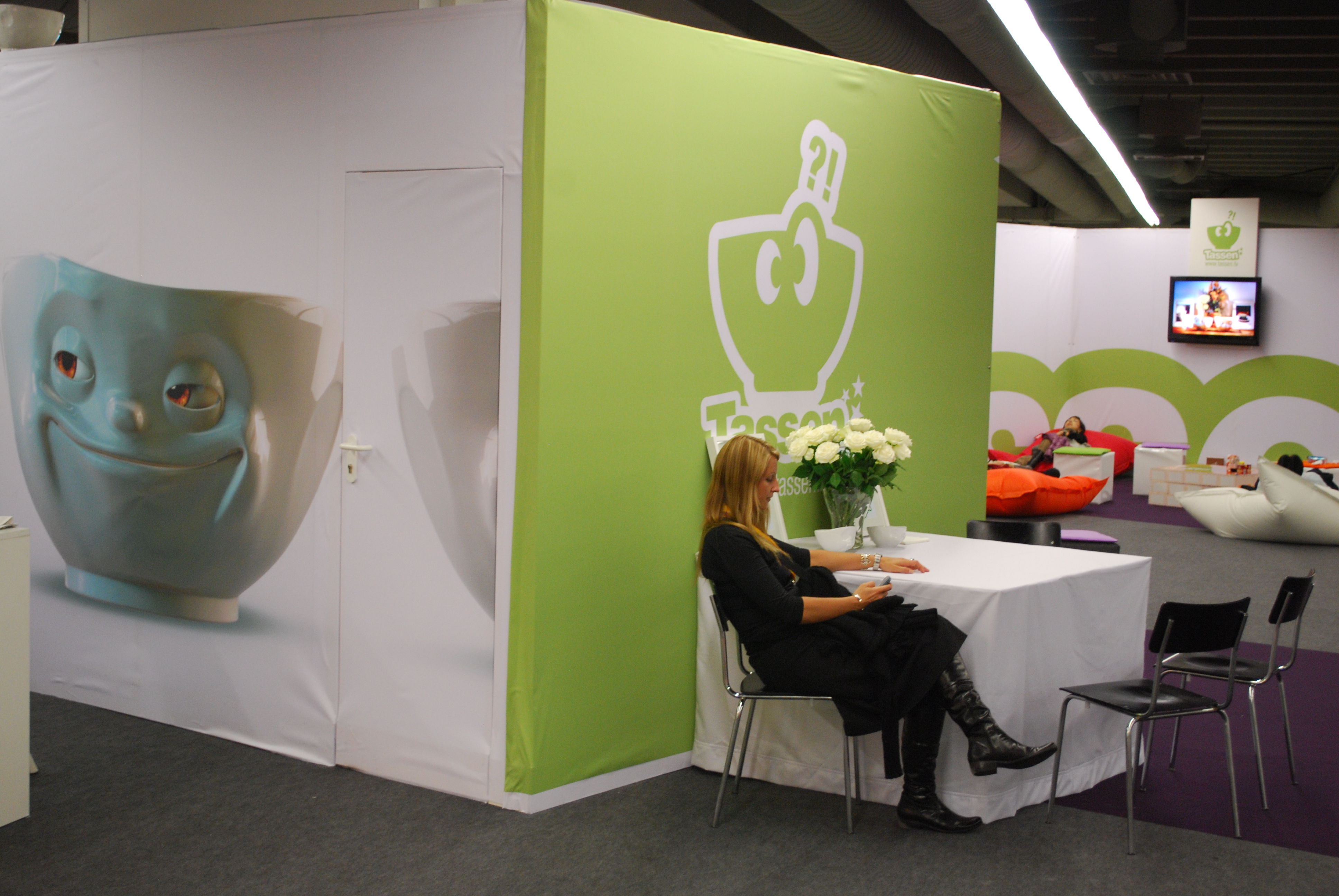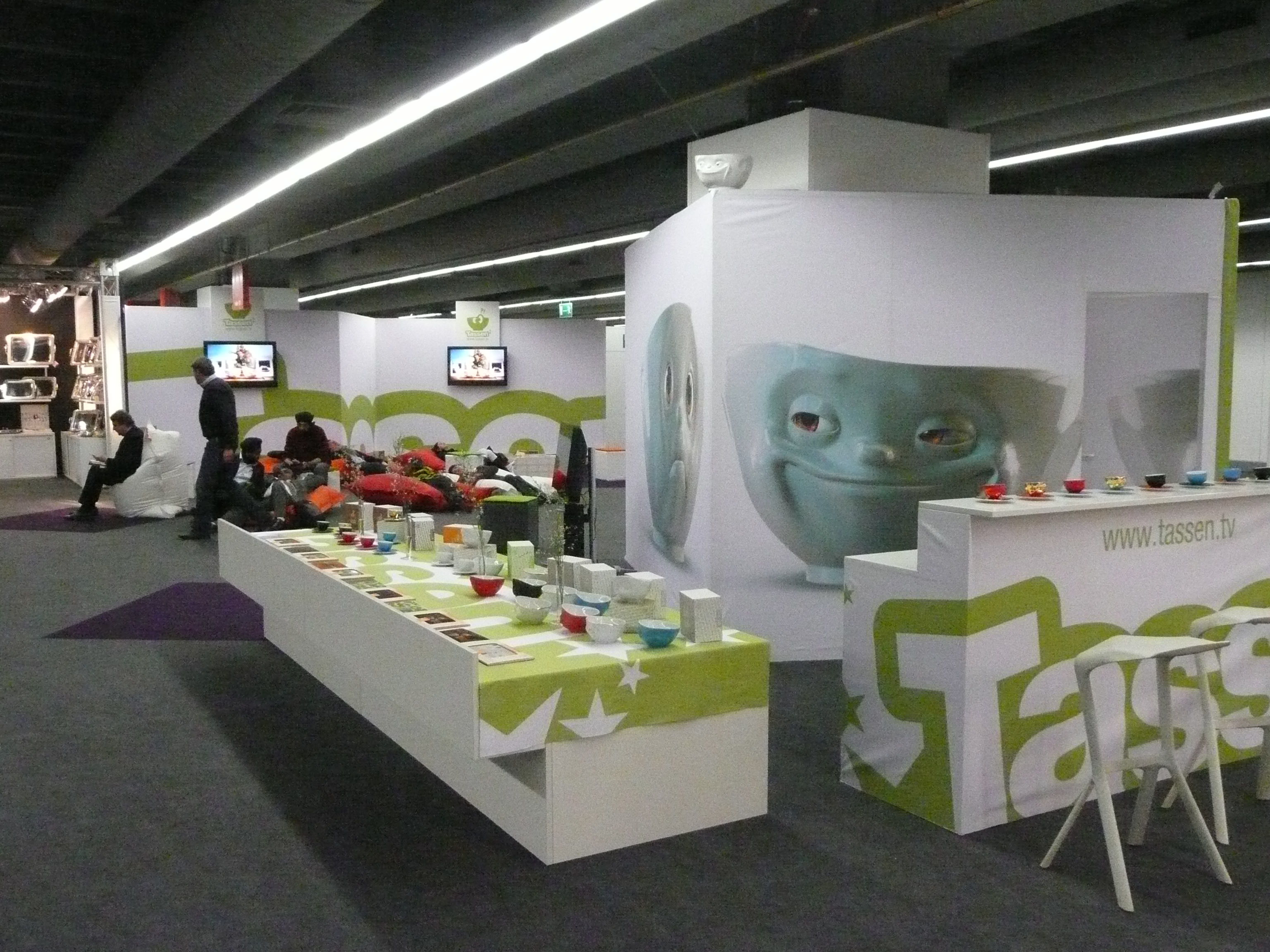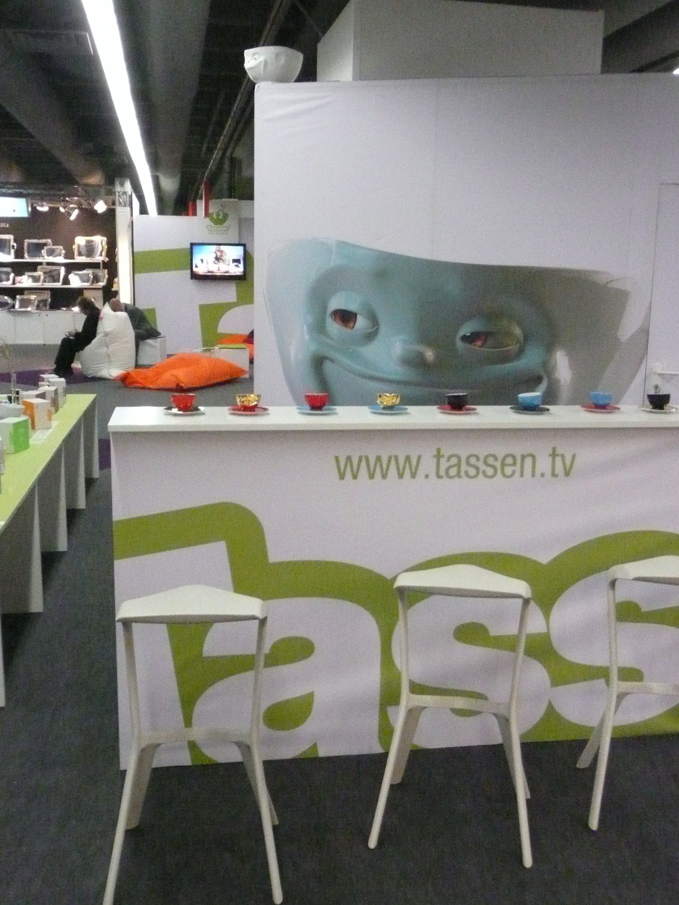 Just like previous trade show editions, this year's TASSEN booth was created with chilling out and relaxing from the stressful trade fair environment in mind. Since this year's theme for the show was "Ambiente goes City," many exhibitors cooperated with retailers around Frankfurt who offered to present their goods at their stores. This is how our TASSEN received the honor of showcasing our goods at the store of upscale audio specialists Bang & Olufsen at their Schillerstrasse location. And as it turned out, we also managed to score an extra TV screen for our booth. That's what we call a win/win situation!