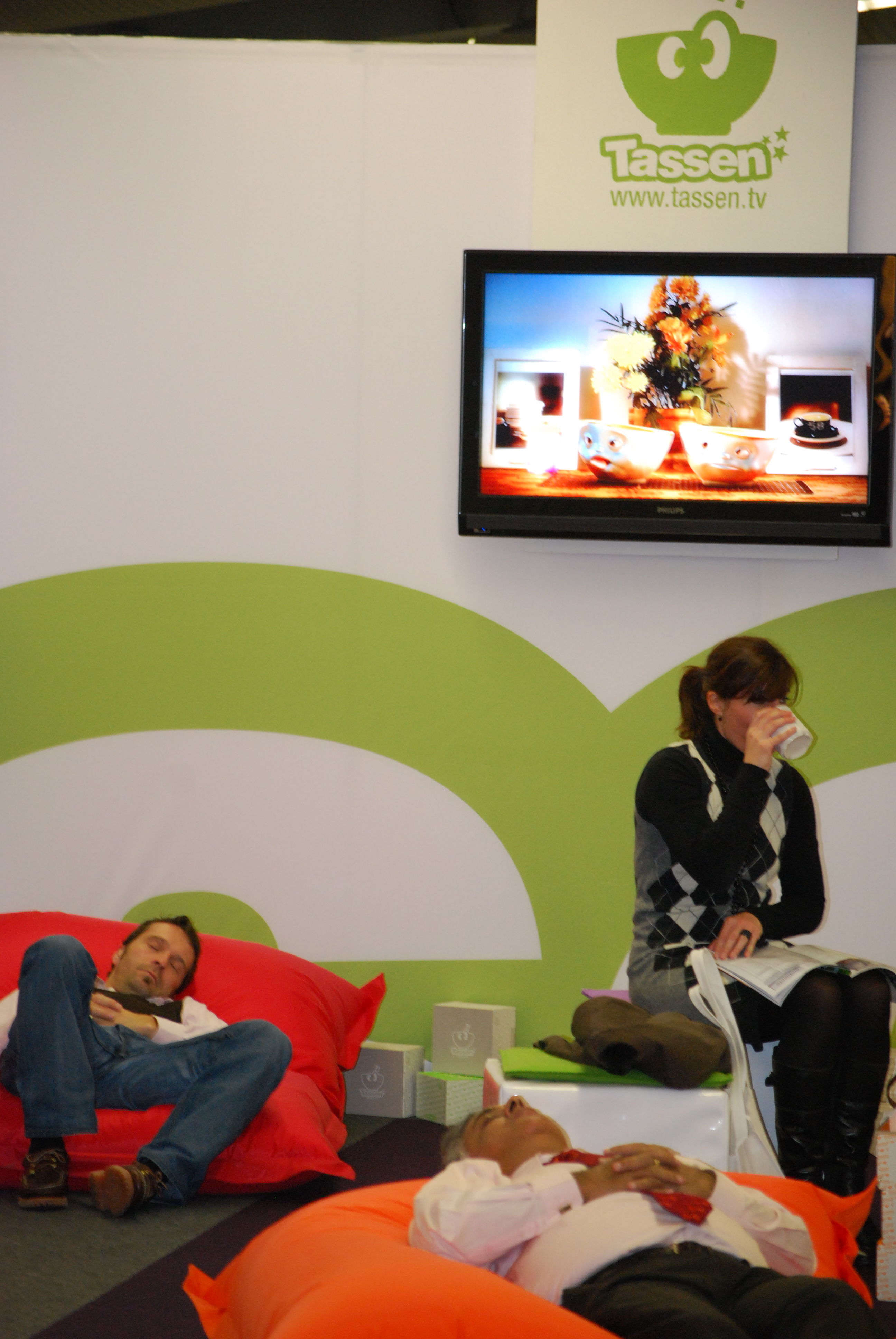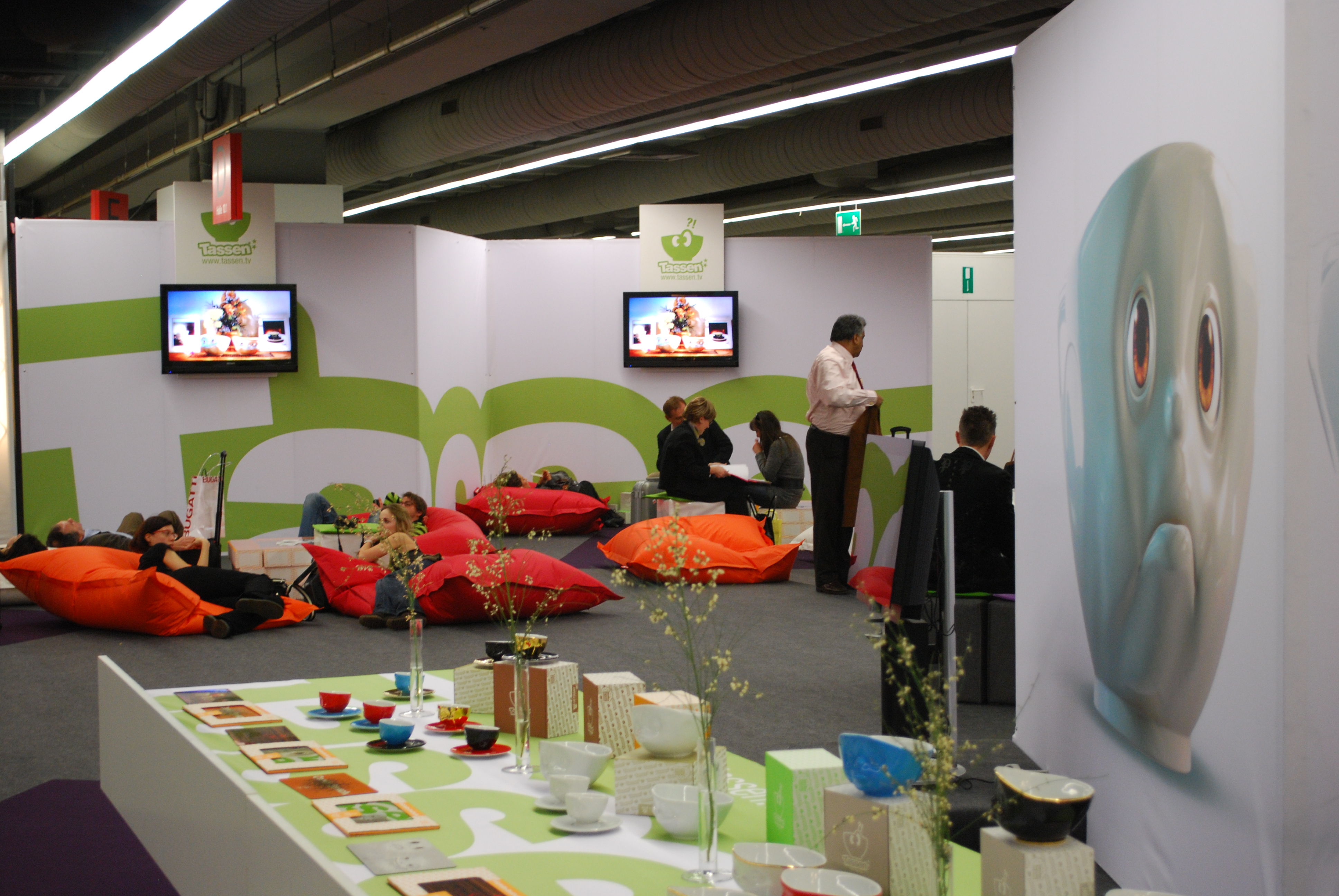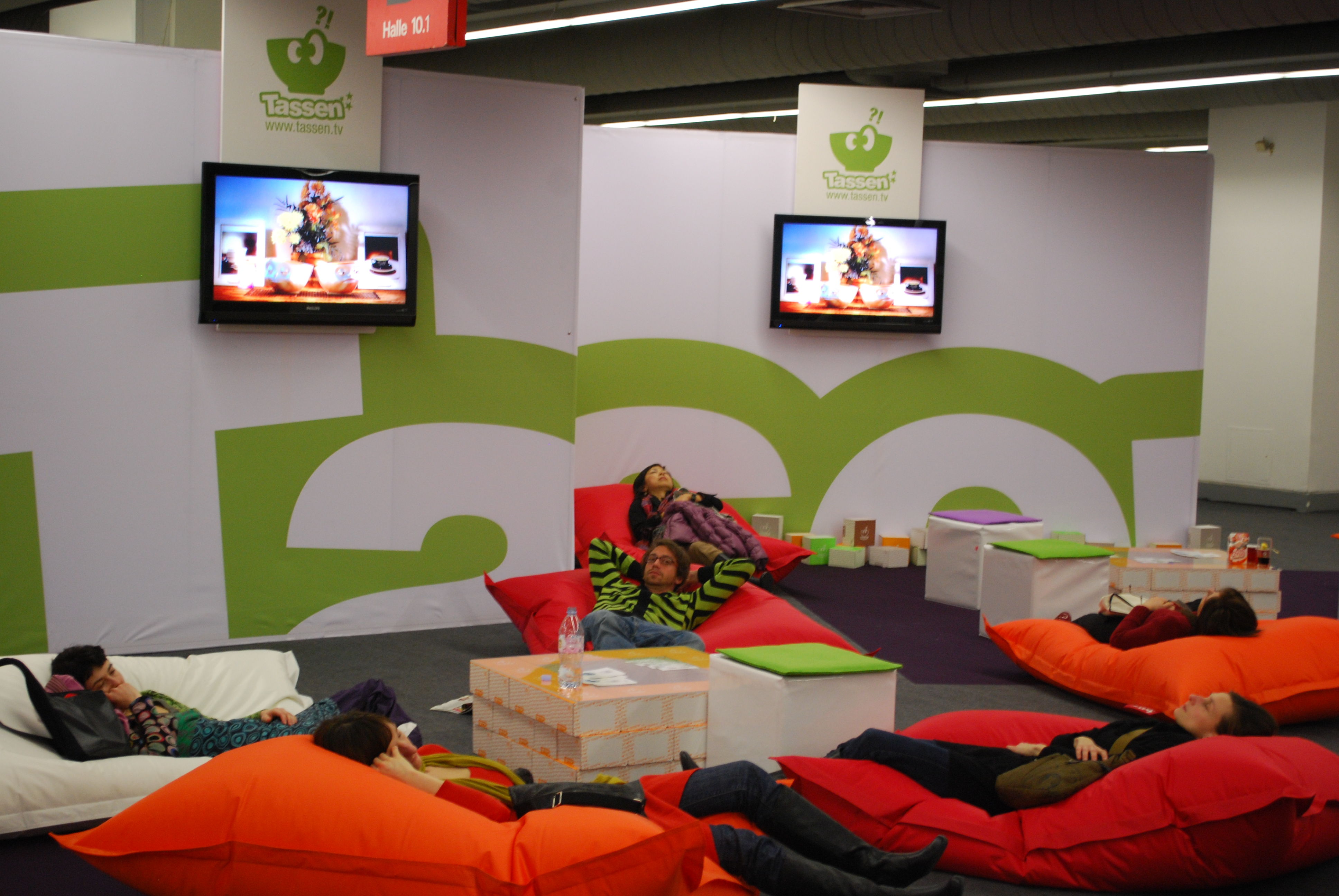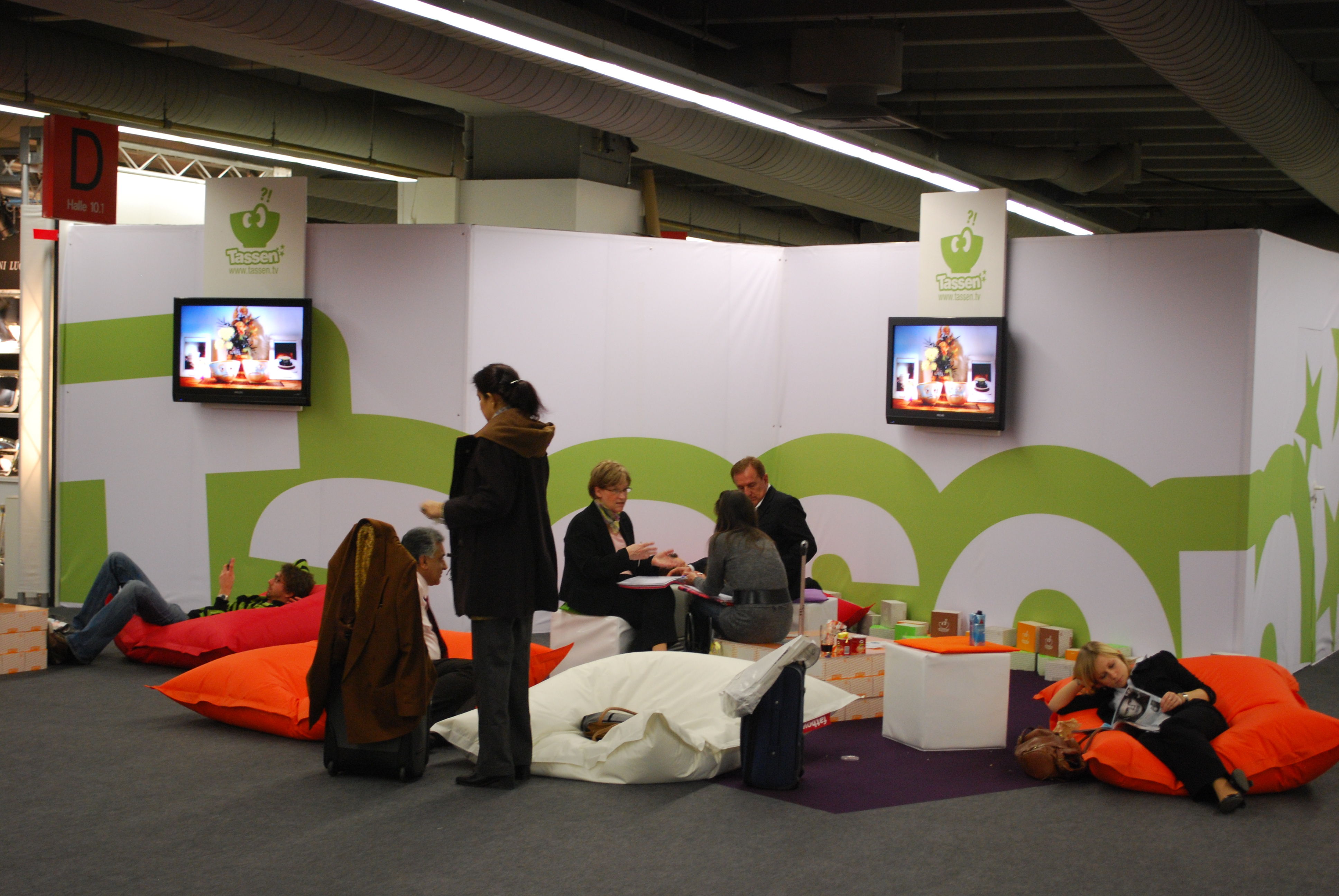 Just like previous trade show editions, this year's TASSEN booth was created with chilling out and relaxing from the stressful trade fair environment in mind. Since this year's theme for the show was "Ambiente goes City," many exhibitors cooperated with retailers around Frankfurt who offered to present their goods at their stores. This is how our TASSEN received the honor of showcasing our goods at the store of upscale audio specialists Bang & Olufsen at their Schillerstrasse location. And as it turned out, we also managed to score an extra TV screen for our booth. That's what we call a win/win situation!