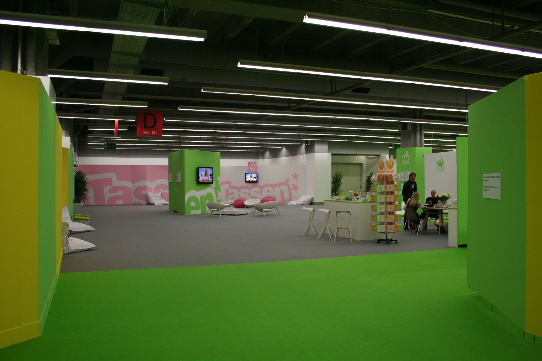 We approached the task with relish and created an equally bright and colorful space, as well as a quiet haven to offer a break from the busy trade show environment. This cozy set-up, replete with comfy lounge chairs and ambient music, really struck a nerve with many visitors from Asia, who used the opportunity to battle their jet-lag with a quick trade show nap.
