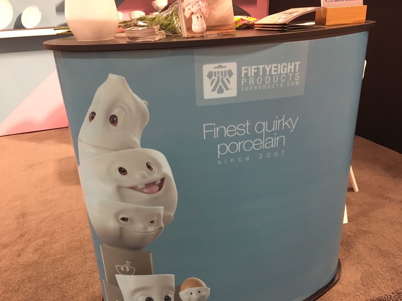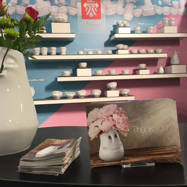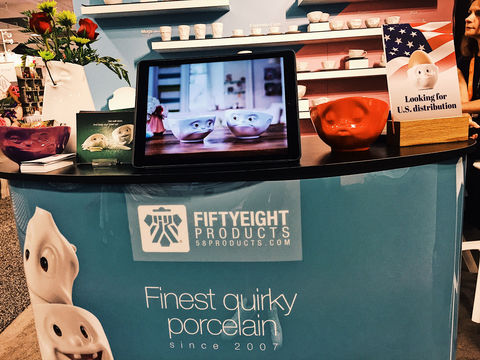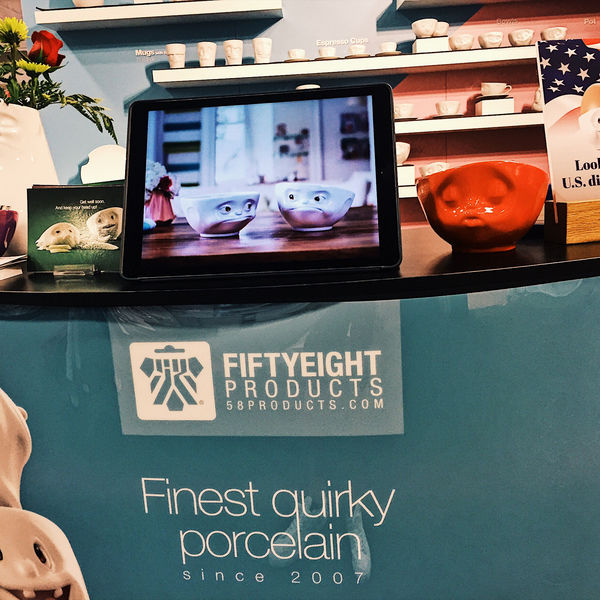 The show launched on Thursday morning and our booth looked flawless, all our porcelain made the long trip intact. Right after opening, the first visitors find their way to our segment and provide immediate feedback. They don’t like our products, it turns out, they LOVE them! Although most American buyers and store owners have never heard of Fiftyeight Products before, they immediately have the emotional response we were hoping for. “Sooo Cuuute!!!”, “Those are darling!”, “Ah, so quirky!” some respond, while many are impressed with the quality and finish of our porcelain. Some are reminded of Disney movies (thanks for the compliment), and everyone likes our animated films showcased on loop at our booth. And many also recognize that our products are “Made in Germany” as a seal of craftsmanship.